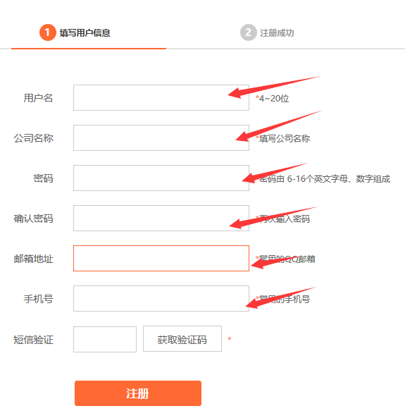 2. 通过填写红色箭头指示的信息框按照其规格填写信息,最后在获取手机所受到的验证码,点击“注册”按钮,即可进入到成功注册的页面。在您注册成功之后可以在会员中心的信息资料栏里完善您的个人信息。