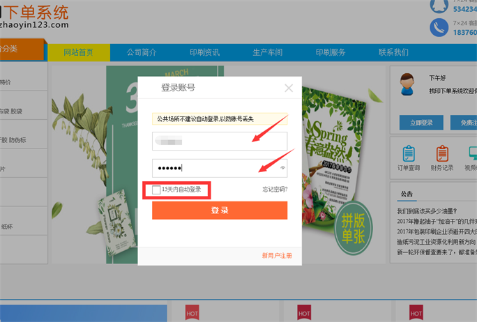 3.您可以您注册过得账户使用账户名和密码进行登录,可通过勾选选择是否在15天内自动登录,点击登录按钮之后可进行报价,下单,管理等操作。